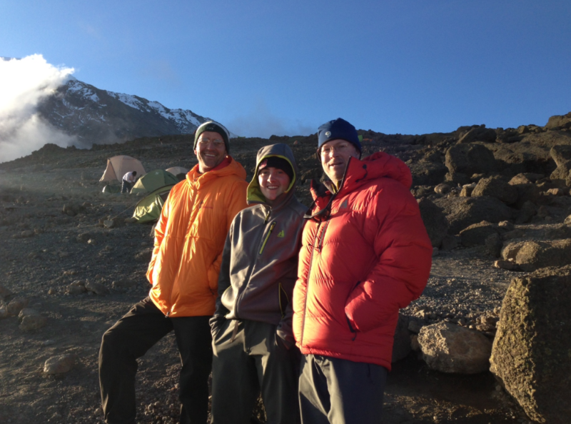 Although heavy mist prevented climbers from seeing distant views from the Shira Plateau on day 2, the next morning’s sun made it possible to see the mountain. Climbing up to the high point of the day of 14,900, the team first tackled the dry and rocky terrain of the Highland Desert Zone where the scenery included large volcanic boulders. After a break to gather their bearings from a long ascent that day, they then made their way down to camp in the Barranco Valley at 12,800 and joined one another in the dining tent for the evening. John relayed back to us the strategy of climbing high and sleeping low which is important at such high altitudes and atmospheres.