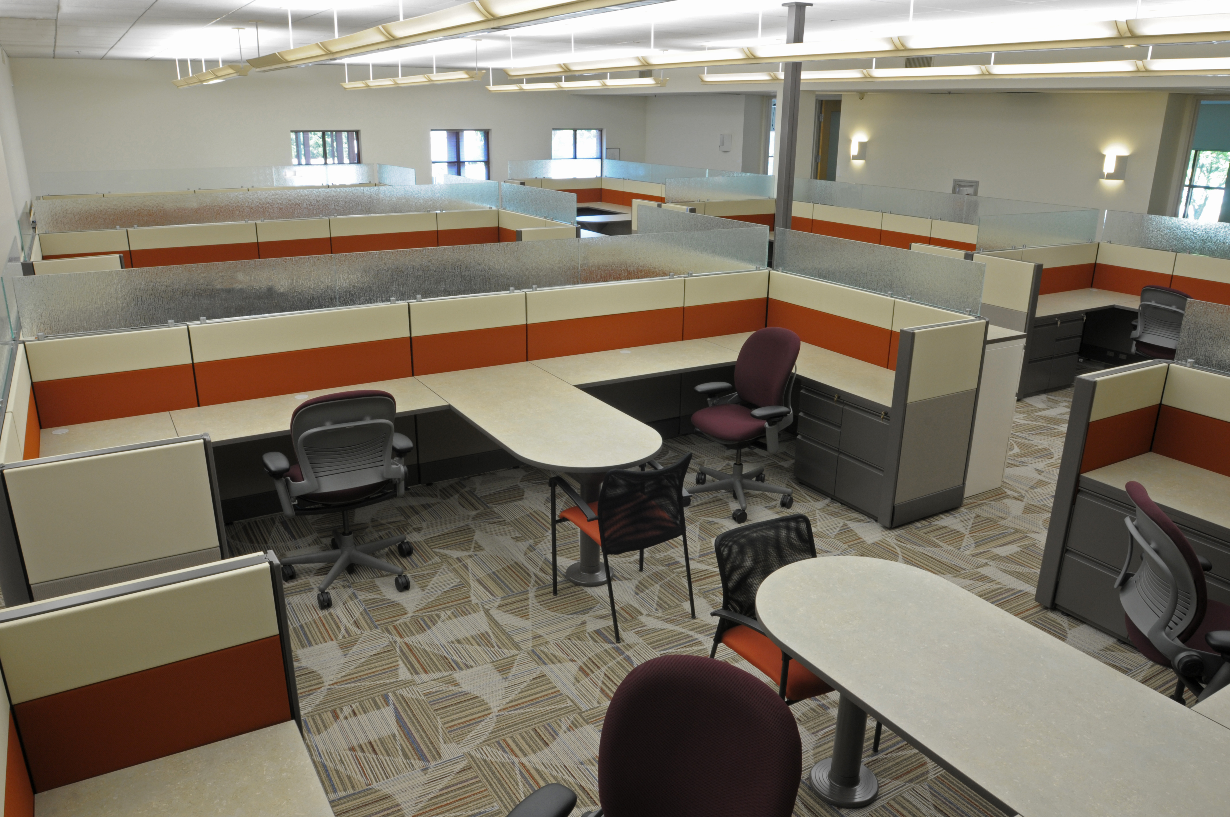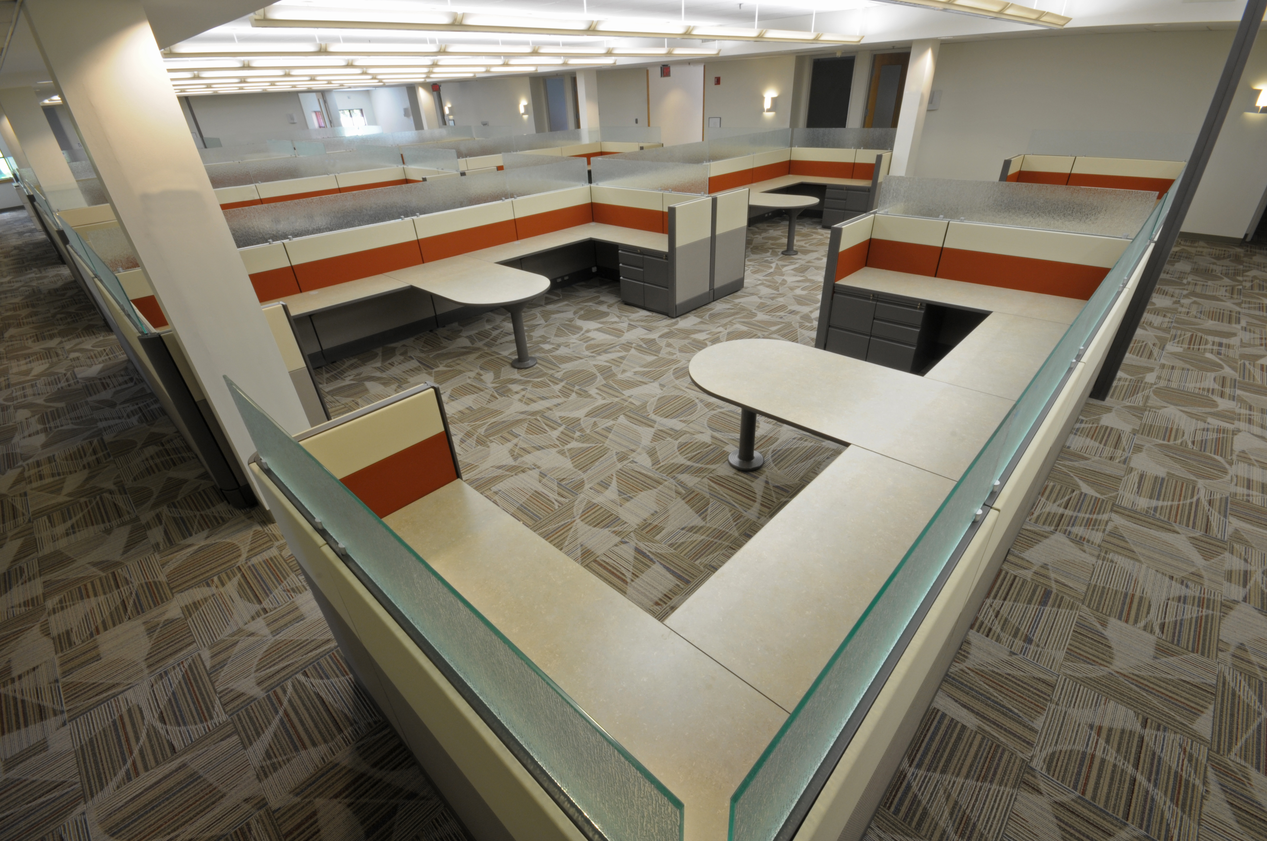 office cubiclesAfter the typical clusters were developed, EthoSource presented the various heights, components and configuration options for their Ethospace stations which provided them a ton of possibilities to create their desired work environment.  Peninsulas were incorporated into the design to allow for impromptu meeting spots and collaborative work areas. Low-height workstations created the open atmosphere, and beautiful up-mount glass provided just the right amount of privacy between stations, as well as a very cool look to the overall theme.