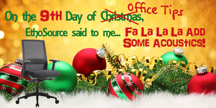 The best part about the open office plan is the ability to freely and easily communicate with others throughout the workday for collaborative tasks. The worst part? Noise. Whether you want to hear different conversations going on throughout the day or not, in this new office design trend, it can be very one-dimensional unless you take the right precautions. So! We can help you keep the balance with this useful tip. On the 9th Day of Office Tips, EthoSource said to me… Fa la la la Focus on Acoustics!!