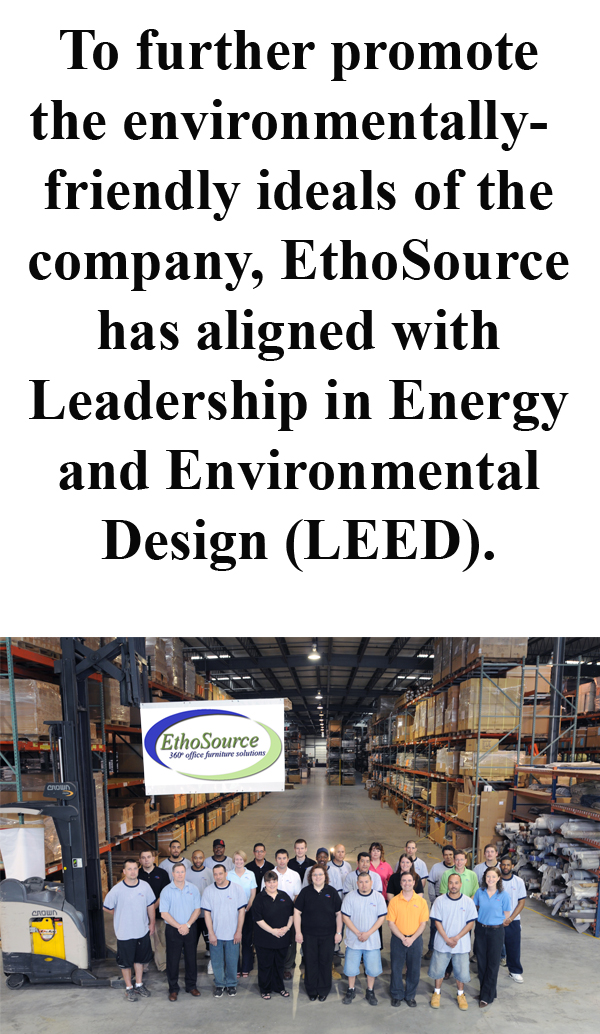 The customization of Ethospace furniture can also be “green,” as the clients can switch out fabrics or alter the look of their furniture by selecting recycled options to replace the original look.”Usually going green is more expensive,” says Gallen. “But with our eco-friendly office furniture, you can save money and be green.”   To further promote the environmentally-friendly ideals of the company, EthoSource has aligned with Leadership in Energy and Environmental Design (LEED). The U.S. Green Buidling Council administers the LEED program. The Council rates new buildings based on criteria including water efficiency, energy and atmosphere, materials and resources, and indoor environmental quality. EthoSource works directly with clients to help them earn points toward LEED certification.