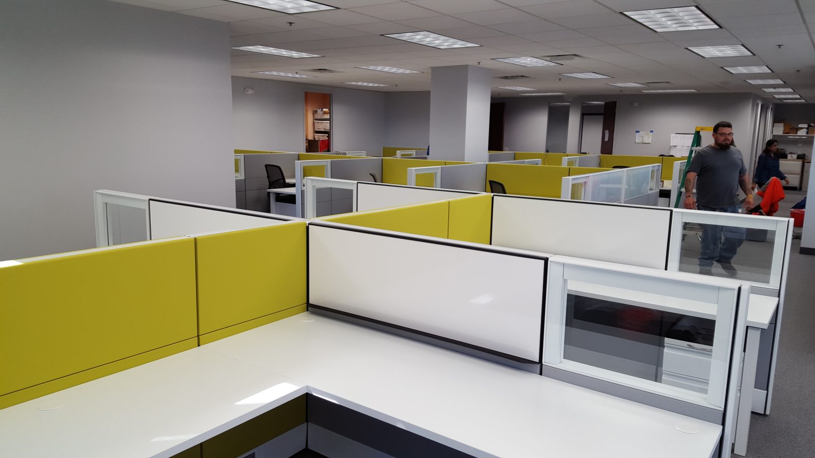 The first part of the challenge is just part of our daily responsibilities here at Ethosource.   KPIT’s personal Ethosource designer worked with the customer to learn exactly what look they were going for, as well as what functional aspects of the workstations they needed for each employee.  The sales rep and project manager on the project managed what product needed to be pulled from our 100,000 square foot warehouse of Herman Miller Ethospace parts to custom build the workstations with low-height walls, glass tiles, white board tiles and bright green fabric tiles.
